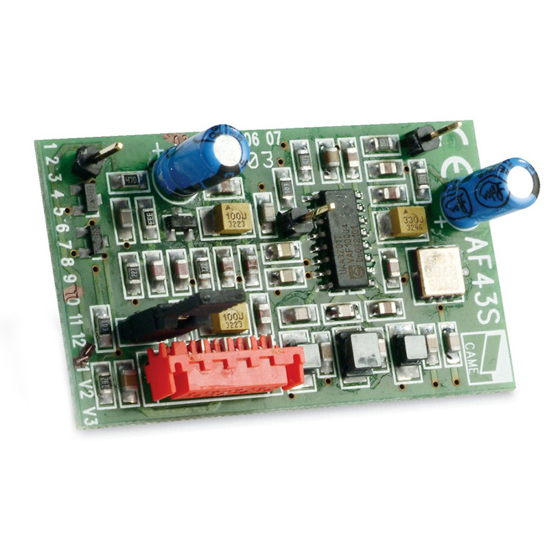 AF868 – встраиваемый радиоприемник (плата радиоканала), используется только совместно с блоками управления CAME. Приемник подключается к блоку управления через стандартный разъем. Радиоприемник предназначен для работы с брелками CAME серии TOP (TOP-862NA и TOP-864NA), работающими на частоте 868МГц со статическим кодом, а также может работать в паре с платой радиодекодера RBE4N для использования пультов ДУ этих серий. Использовать частоту 868МГц в системах радиоуправления бывает целесообразно в зонах с неуверенным приемом на других частотах. Радиоприемник принимает сигнал от пульта и передает его в память, находящуюся в блоке управления автоматических ворот или шлагбаума CAME. В зависимости от блока управления возможно управлять одной или двумя функциями привода ворот.