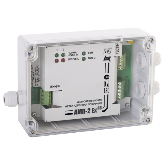 АМП-2Ex-R3 – адресная метка искробезопасная для контроля за состоянием пожарных зон во взрывоопасных помещениях и зонах защищаемого объекта посредством двух искробезопасных шлейфов сигнализации. Работает под управлением приемно-контрольного прибора Рубеж-2ОП прот.R3.