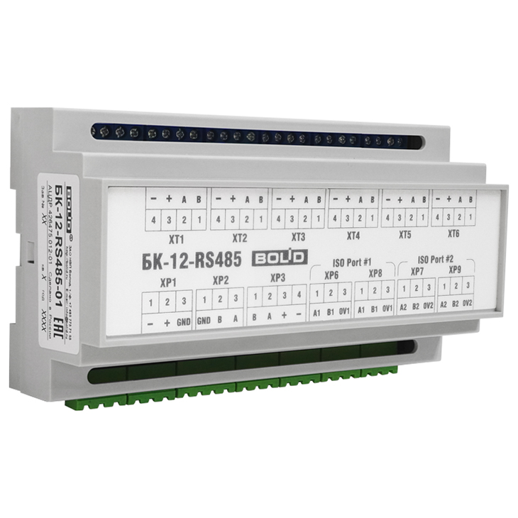 БК-12-RS485-01 – блок коммутации, предназначен для установки в монтажные устройства (шкафы, боксы и т.п.) с целью организации резервированной линии связи RS-485 между компонентами блочно-модульных приборов приемно-контрольных и управления пожарных (ППКП и ППКУП) с учетом требований СП 484.1311500.2020.