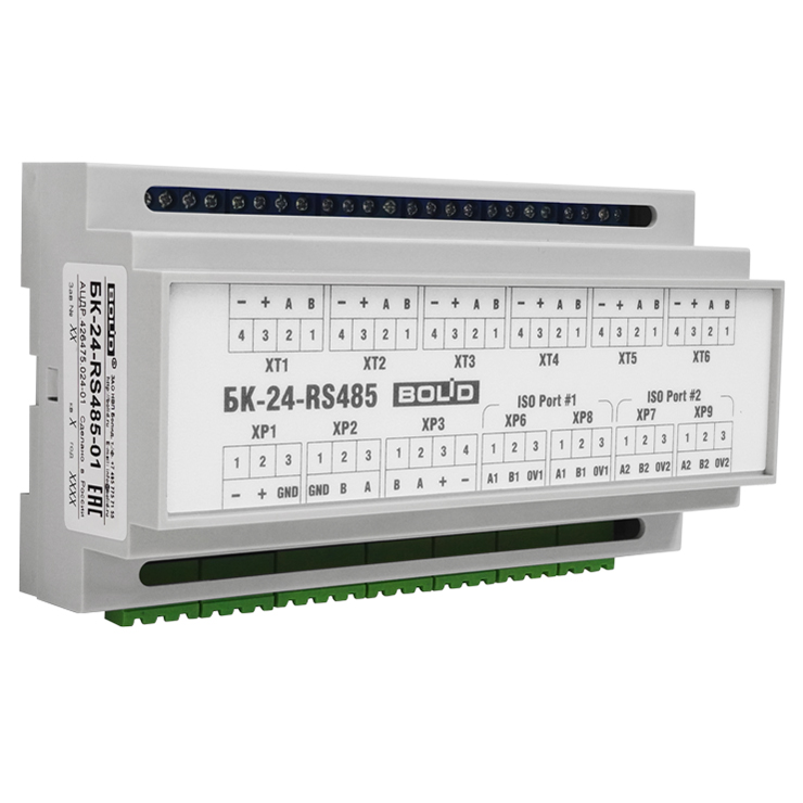 БК-24-RS485-01 – блок коммутации, предназначен для установки в монтажные устройства (шкафы, боксы и т.п.) с целью организации резервированной линии связи RS-485 между компонентами блочно-модульных приборов приемно-контрольных и управления пожарных (ППКП и ППКУП) с учетом требований СП 484.1311500.2020.