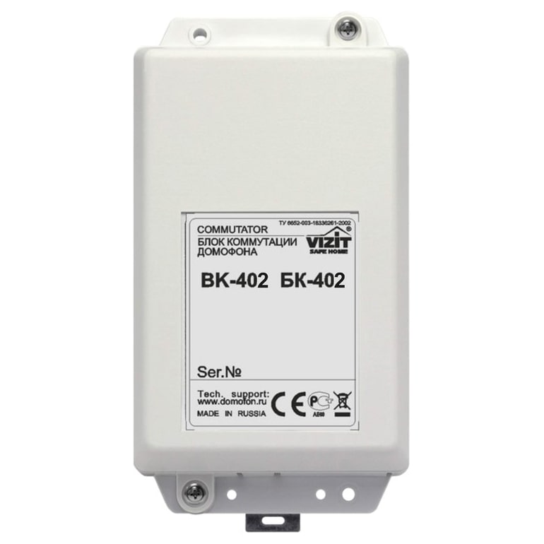 БК-402 – блок коммутации домофона обеспечивает переключение линий связи и видеосигнала. Применяется в составе системы ограничения доступа в огороженную придомовую территорию в случае, если огороженная территория имеет два или более входа.