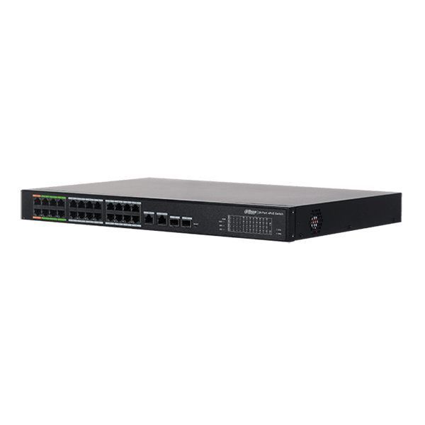 DH-LR2218-16ET-240 – управляемый коммутатор второго уровня оборудован четырьмя гигабитными RJ-45, 16 РоЕ-портами. Восемь из PoE-портов поддерживают ePoE: передают данные и подают питание на расстояние до 800 метров по витой паре и до 1000 метров — по коаксиальному кабелю. На максимальном расстоянии скорость составляет 10 Мбит/с.