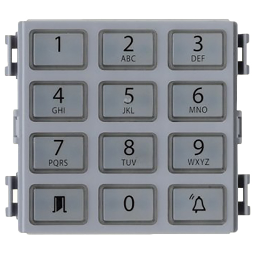 12-кнопочный модуль из технополимера PC/ABS. Кнопки от 0 до 9 для набора кода и две кнопки основных функций: вызова абонента и подтверждения кода доступа.