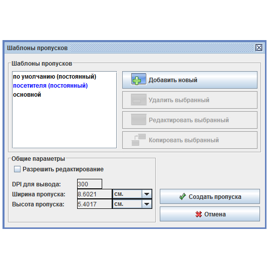 - редактировать атрибуты шаблона (имя, размер, разрешение вывода в пикселях);