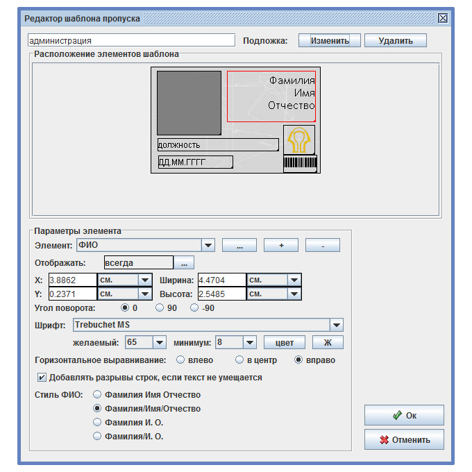 - редактировать содержимое шаблона (текстовые поля, штрих-код, фотография, фон, произвольные изображения).