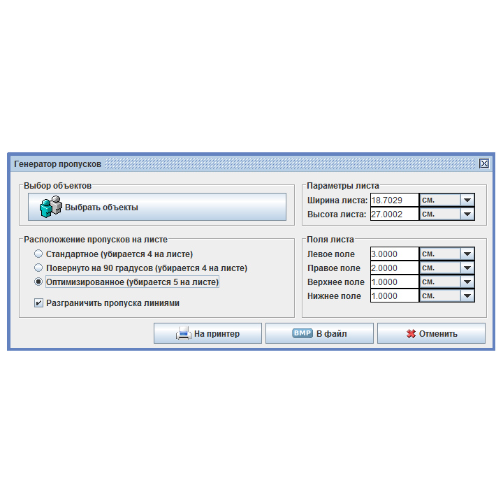 - настройка параметров (размер листа, отступы, разграничение пропусков линиями, использование макетов);
