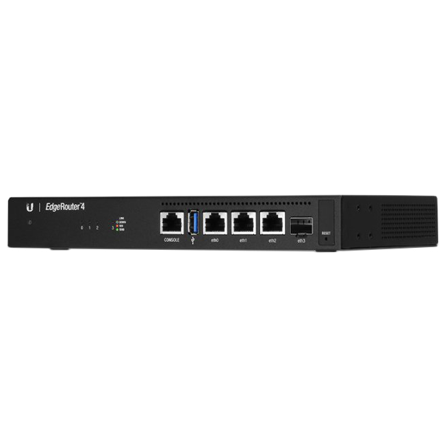 EdgeRouter 4 – высокопроизводительный маршрутизатор, который эффективнее, чем тот же EdgeRouter, на 50%. Имеет 3 гигабитных Ethernet-порта и 1 SFP-порт для оптоволоконной связи. Скорость маршрутизации достигает 3.4 миллионов пакетов в секунду (при их размере до 64 байт), а канальная скорость составляет 4 Гбит/с (128 байт и больше).