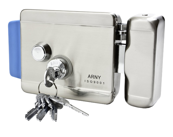 Накладной электромеханический замок для наружной установки на деревянные и металлические двери и калитки. Открывается импульсом электрического тока (12V), а также ключом или с помощью встроенной механической кнопки