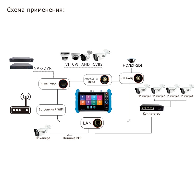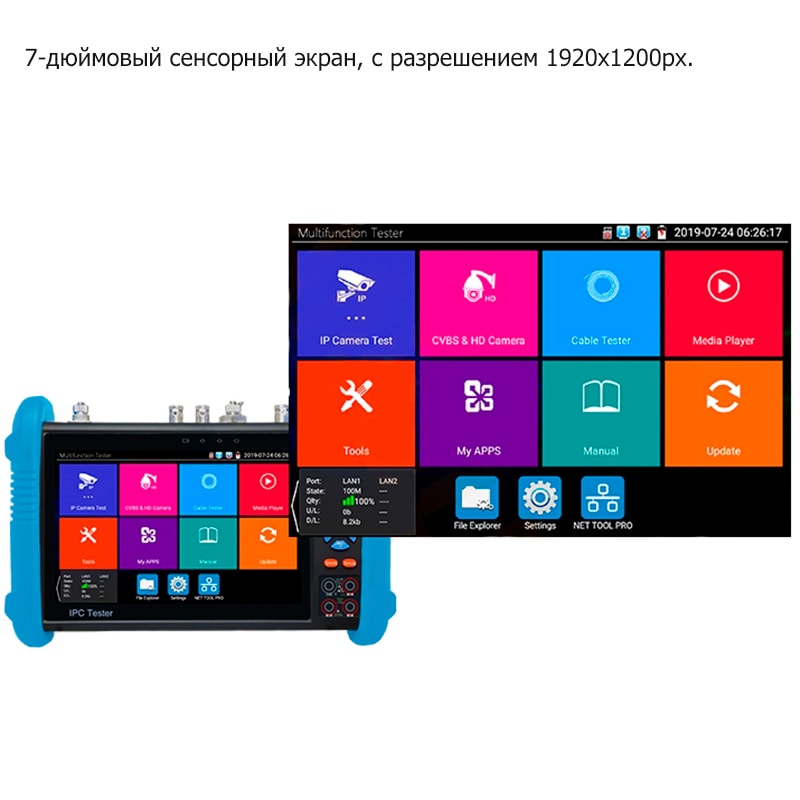 Expert-7IP/MGOT V2 – гибридный IP видеотестер с большим Touch Screen экраном 7 дюймов, позволяет работать со всеми популярными в данный момент стандартами: аналоговыми CVBS камерами, AHD камерами, CVI камерами, TVI камерами и IP камерами. Поддерживается разрешения аналоговых камер до 5Mp и IP камер до 4К. С помощью видеотестера можно получать на экране изображение с камер любого из 6-ти стандартов, а также производить запись и просмотр скриншотов или видео на SD карту (8Гб в комплекте). Управление видеотестером может производится как с помощью кнопок, расположенных на корпусе, так и с помощью емкостного экрана Touch Screen через дружественный интерфейс.