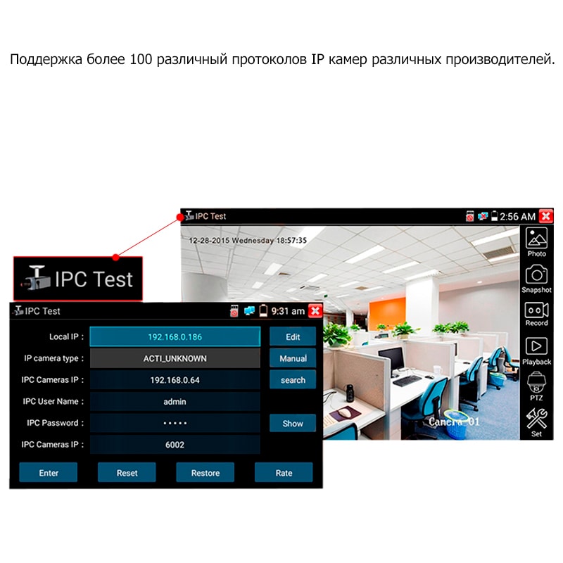 - получение изображения с IP камер по встроенным протоколам, ONVIF, RTSP, Android приложениям;