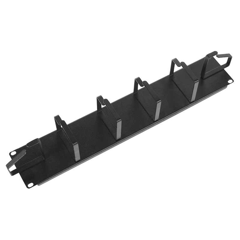 Выполнен из цельнометаллической панели высотой 2U. На лицевой стороне органайзера размещены 6 металлических колец для фиксации кабеля.