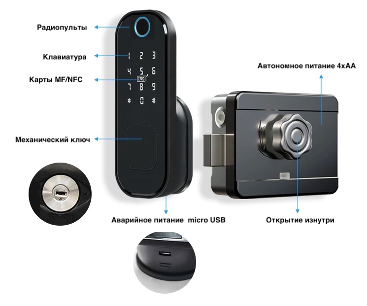 Подать питание можно через разъем Micro USB, который расположен на наружной части замка. Это можно сделать либо через обычный блок питания мобильного телефона либо от внешнего аккумулятора (типа Power Bank).