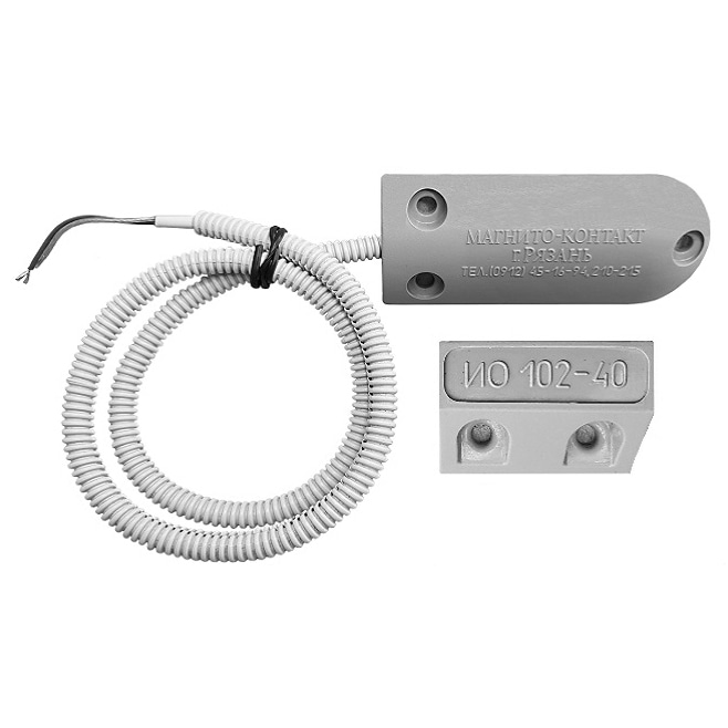 ИО 102-40 А3П (2) серый – извещатель охранный точечный магнитоконтактный, предназначен для блокировки гаражных ворот, ангаров, железнодорожных контейнеров, телефонных шкафов и других конструктивных магнитопроводящих (металлических) и магнитонепроводящих (алюминиевых, деревянных и т.д.) элементов зданий и сооружений на открывание и смещение с выдачей в шлейф приемно-контрольного прибора извещения о тревоге путем размыкания или замыкания контактов геркона.