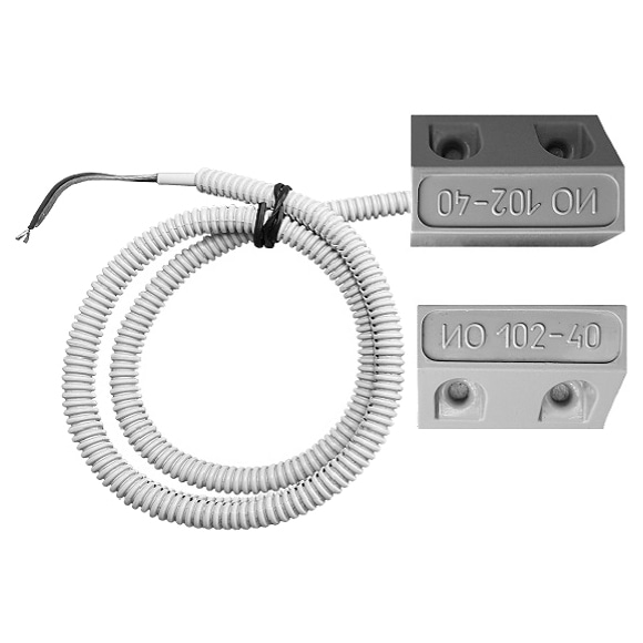ИО 102-40 Б2П (2) серый – извещатель охранный точечный магнитоконтактный, предназначен для блокировки гаражных ворот, ангаров, железнодорожных контейнеров, телефонных шкафов и других конструктивных магнитопроводящих (металлических) и магнитонепроводящих (алюминиевых, деревянных и т.д.) элементов зданий и сооружений на открывание и смещение с выдачей в шлейф приемно-контрольного прибора извещения о тревоге путем размыкания или замыкания контактов геркона.