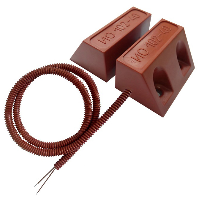 ИО 102-40 Б2П (2) терракотовый – извещатель охранный точечный магнитоконтактный, предназначен для блокировки гаражных ворот, ангаров, железнодорожных контейнеров, телефонных шкафов и других конструктивных магнитопроводящих (металлических) и магнитонепроводящих (алюминиевых, деревянных и т.д.) элементов зданий и сооружений на открывание и смещение с выдачей в шлейф приемно-контрольного прибора извещения о тревоге путем размыкания или замыкания контактов геркона.