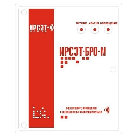 Ирсэт-БРО-М – блок речевого оповещения предназначен для работы в составе системы речевого оповещения ИРСЭТ в качестве устройства для формирования и трансляции речевых сообщений о возникновении опасности, инструкции по эвакуации, трансляции фоновой музыки и информации.