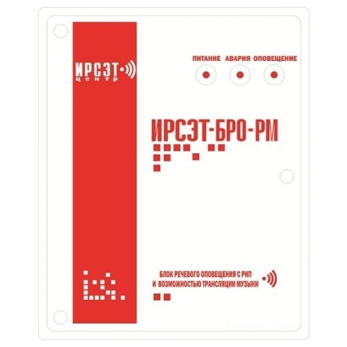 Ирсэт-БРО-РМ – блок речевого оповещения предназначен для работы в составе системы речевого оповещения ИРСЭТ в качестве устройства для формирования и трансляции речевых сообщений о возникновении опасности, инструкции по эвакуации, трансляции фоновой музыки и информации. Оснащен резервным источником питания.