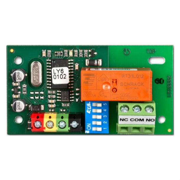 JA-110N – модуль сильноточных выходов реле, предоставляющий один переключаемый релейный выход (8А) с параметрами NO или NC. Соответствующий выход PG программируется переключателями DIP (один из 32 выходов PG). Связь и питание модуля осуществляется от ШИНЫ контрольной панели. Модуль не является адресным, имеет возможность установки в корпус JA-190PL.