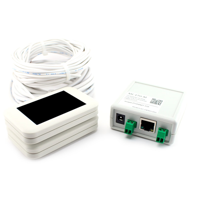 В состав входят: проводные сенсоры MCount, монтажные провода, Ethernet модуль передачи данных, кабель UTP, кронштейны крепления.