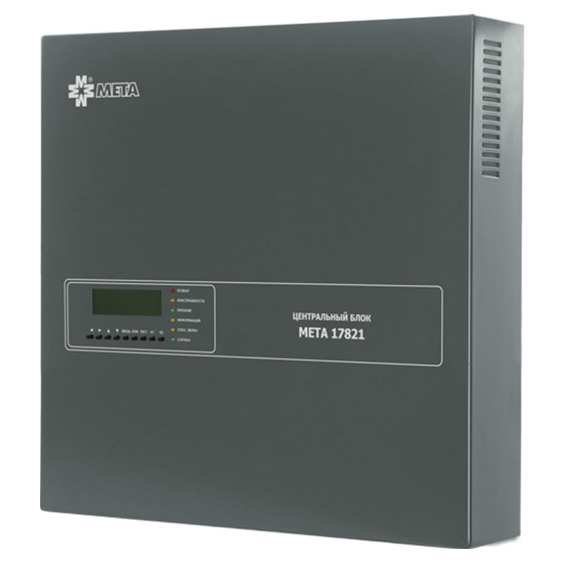 МЕТА 17821 – центральный блок системы речевого оповещения. Предназначен для работы в составе прибора пожарного управления оповещением и является основным блоком в этом приборе. При возникновении пожара и других чрезвычайных ситуаций (ЧС), введения степеней готовности Гражданской обороны (ГО) ЦБ обеспечивает трансляцию речевых сигналов оповещения и специального звукового сигнала СИРЕНА.