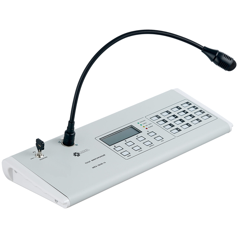 МЕТА 18630-32 – пульт микрофонный, предназначен для работы в составе системы оповещения, совместно с приборами МЕТА 17950/17951. Обеспечивает возможность речевого оповещения от микрофона и запуска в ручном режиме ранее записанного сообщения.