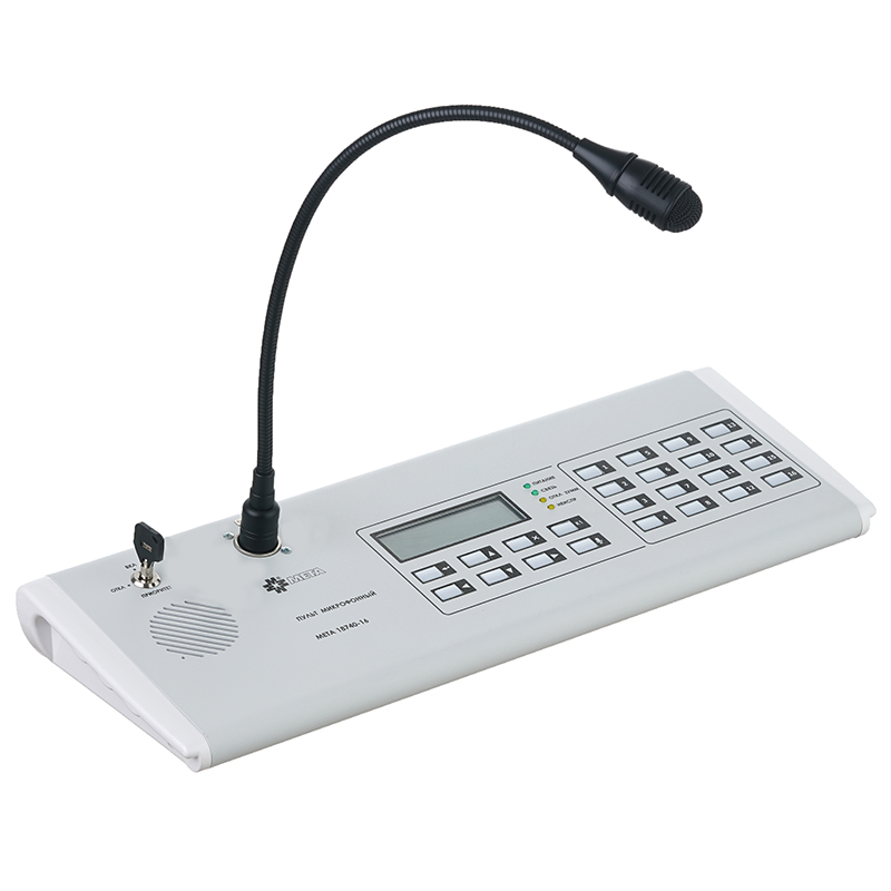 МЕТА 18740-24 – пульт микрофонный, предназначен для создания двусторонней связи между помещениями пожарного поста диспетчерской и зонами пожарного оповещения в составе систем 4-го типа, управления эвакуацией диспетчерской связи, в том числе для связи МГН.