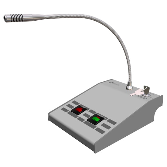 Пульт представляет собой настольное устройство, на панели которого расположены микрофон на гибком держателе типа «гусиная шея», ключ доступа «БЛОКИРОВКА ВКЛ/ВЫКЛ», кнопка «СИРЕНА» и кнопка «МИКРОФОН» со встроенными индикаторами.