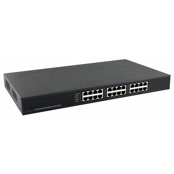 - порты: вх 12×RJ45 (10/100/1000 Base-T), вых 12×RJ45 (10/100/1000 Base-T, PoE, IEEE 802.3af/at);