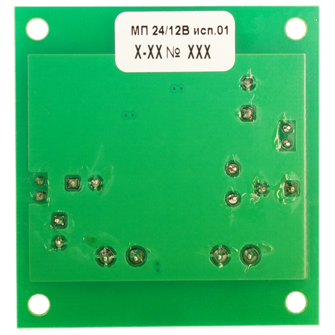 МП 24/12 В исп.01 – модуль преобразователя, предназначен для питания видеокамер (в т.ч. наружного наблюдения), извещателей, приемно-контрольных приборов охранной и охранно-пожарной сигнализации и других потребителей напряжением 12В или 9В постоянного тока.