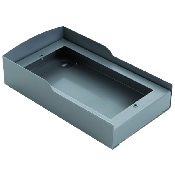 Коробка с противодождевым козырьком из окрашенной листовой стали с отверстиями для прокладки кабелей и крепежными шурупами.