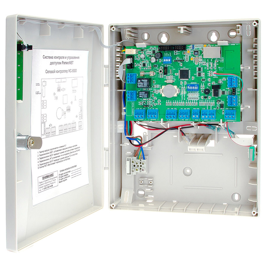 NC-8000 – сетевой контроллер, для использования в составе СКУД ParsecNET 3 и ParsecNET Office. Сочетает в себе два интерфейса подключения: Ethernet и RS-485. Данную модель отличает расширенный объем памяти и базы данных по сравнению с более ранними моделями (NC-1000, NC-5000, NC-2000-IP). Каждый контроллер поддерживает оборудование одной точки прохода, а также систему охранной сигнализации помещения, связанную с данной точкой прохода. База данных контроллера – 8000 пользователей. Буфер транзакций – 16000 событий. Количество временных профилей – 64, циклических расписаний – 64, праздничных дней – 32.