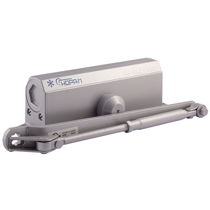 Прочный силуминовый корпус имеет высокие антикоррозийные свойства. Эти характеристики позволяют использовать модель как доводчик на металлическую дверь. Скорость закрывания двери регулируется при установке в двух диапазонах при помощи винтов на корпусе доводчика.