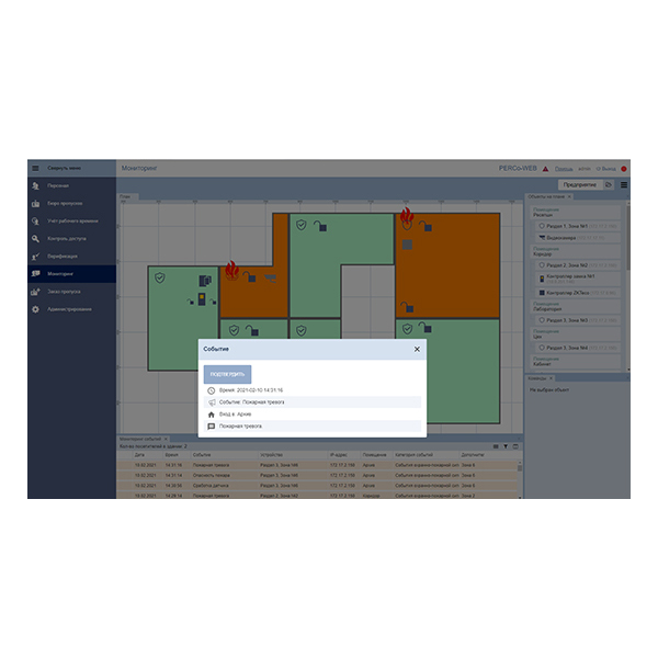 - мониторинг состояния и управление устройствами ОПС «Болид» в интерфейсе системы контроля доступа PERCo-Web;