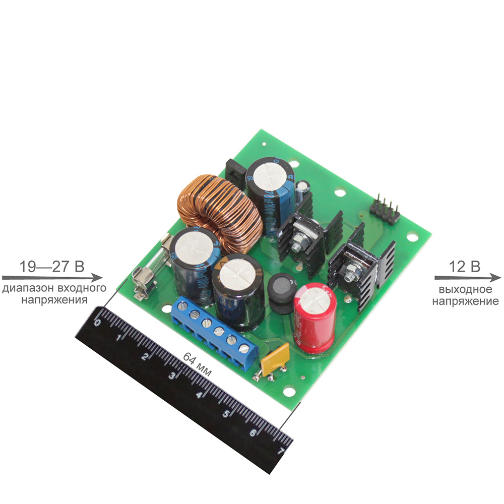 ПН-24АС/12-1,0 – преобразователь напряжения, встраиваемый модуль на печатной плате размером 64х52 мм, преобразует входное напряжение от 19 до 27В переменного тока в выходное стабилизированное напряжение 12В постоянного тока для питания нагрузки с током потребления до 1А.