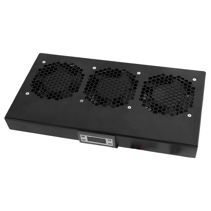 R-FAN-3K-1U-9005 – модуль вентиляторный 19″ с регулируемой глубиной и контроллером в корпусе черного цвета. Используется во всех сериях телекоммуникационных шкафов. Выполнен в системе несущих конструкций 482.6 мм по ГОСТ 28601.2 (19-дюймовые конструктивы по МЭК 297). Фиксируется к вертикальным направляющим в двух точках в горизонтальной плоскости и в вертикальной плоскости с помощью дополнительных кронштейнов (в комплекте).