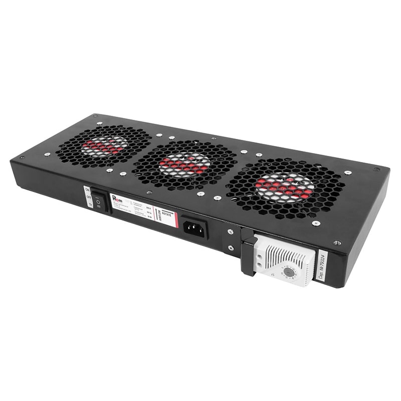 Модуль вентиляторный с тремя односкоростными, осевыми вентиляторами с изменением направления потока (направление потока указан на этикетке стрелкой) и терморегулятором. Порог включения задается в пределах от 0 до +60°С, порог выключения — понижение температуры на 7°С от заданной.