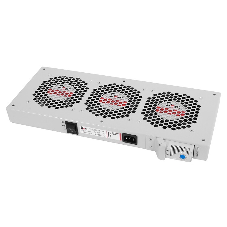 Модуль вентиляторный R-FAN-3T с тремя односкоростными, осевыми вентиляторами с изменением направления потока (направление потока указано на этикетке стрелкой) и терморегулятором. Порог включения задается в пределах от 0 до +60°С, порог выключения — понижение температуры на 7°С от заданной.