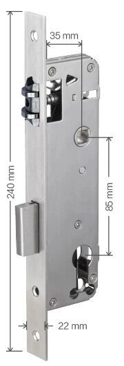 Врезная мортиза для распашных дверей с посадочным размером 35Х85. Фиксация двери роликом. Принудительное запирание на прямой ригель — движением «ручка вверх»