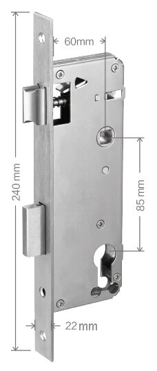 Врезная мортиза для распашных дверей с посадочным размером 60Х85. Автоматическое запирание на косой ригель. Принудительное запирание на прямой ригель — движением «ручка вверх»