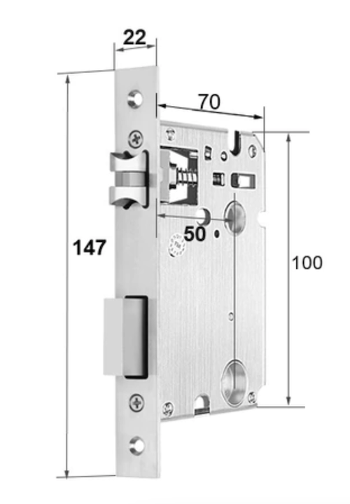 Врезная мортиза для распашных дверей с посадочным размером 50мм. Автоматическое запирание на косой ригель. Принудительное запирание на прямой ригель — движением «ручка вверх»