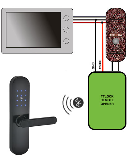 Модифицированный радио-пульт TTLOCK RC с внешним питанием 12в и проводным подключением к управляющему устройству. Предназначен для передачи сигнала «открыть» от домофона или сторонней СКД на любой автономный замок TTLOCK на удалениях до 10-15м.