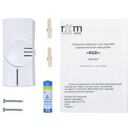 Ritm RGD1 — охранный поверхностный звуковой радиоканальный извещатель, который предназначен для работы в составе радиоканальной системы «Контакт» в качестве датчика разбития стекла. Извещатель RGD формирует сигнал основной тревоги, тревоги дополнительного шлейфа, тревоги тампера вскрытия корпуса и сообщение о разряде батареи и передаёт их на панель. При получении сигнала от извещателя панель формирует сигнал тревоги.