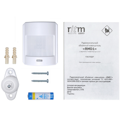 Ritm RMD1 — извещатель охранный, радиоканальный, объемный, оптико-электронный. Применяется для формирования тревоги при обнаружении движения в охраняемом помещении. Имеет тампер для контроля вскрытия корпуса и контакты для подключения дополнительного проводного датчика. Обеспечивает защиту от ложного срабатывания при нахождении животного массой до 10 кг в зоне обнаружения (на расстоянии не менее 3 м от извещателя).