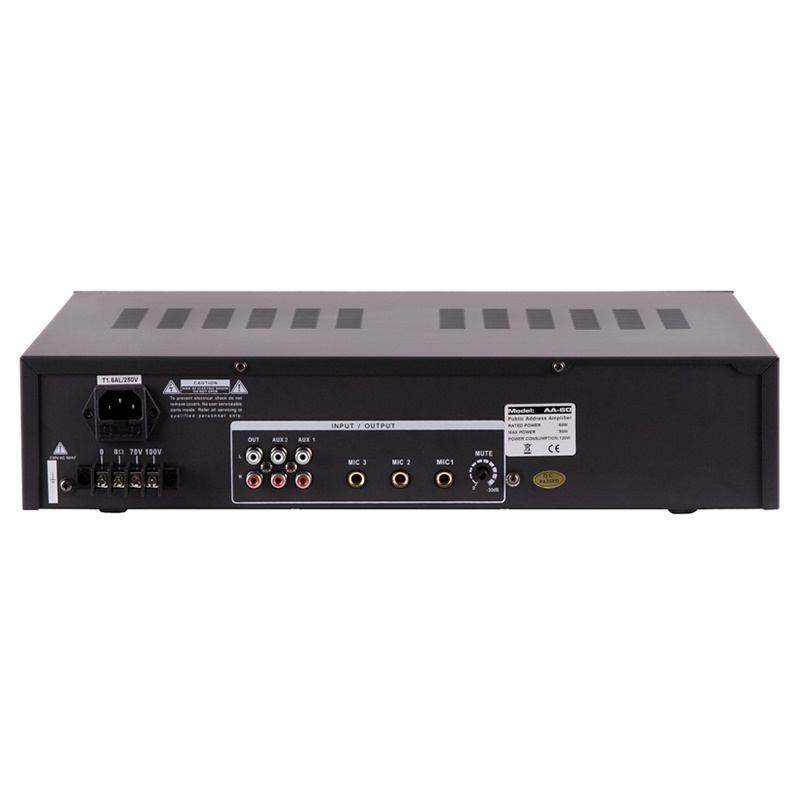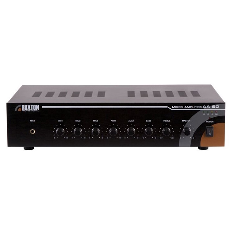 ROXTON AA-60 – трансляционный микшер-усилитель мощностью 60Вт — это решение начального уровня для построения несложных систем речевого оповещения и музыкальной трансляции. В первую очередь он предназначен для озвучивания помещений небольшой площади. Два линейных и четыре микрофонных аудиовхода на задней панели дают широкий выбор источников аудиосигнала, а дополнительные низкоомные аудиовыходы позволяют подключать к усилителю акустические системы бытового и профессионального уровней. Отдельно стоит отметить приоритетный аудиовход при поступлении аудиосигнала на который, звук поступающий с остальных аудиовходов автоматически приглушается. Помимо этого, AA-60 оборудован регуляторами громкости и тембра выходного аудиосигнала, что позволяет получать требуемую выразительность и громкость звучания транслируемой музыки и речи.