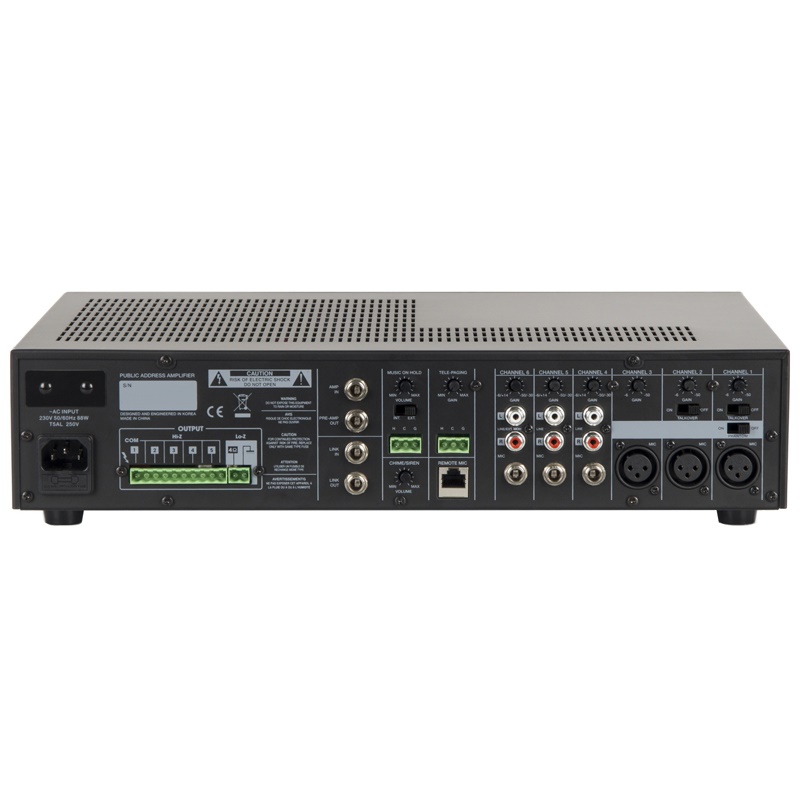 Встроенный селектор зон, коммутирующий высоковольтные выходы усилителя с пятью линиями громкоговорителей даёт возможность выбора, в какие зоны транслировать аудиосигнал. Помимо этого, усилитель оборудован 7-полосным графический эквалайзером выходного аудиосигнала, позволяющего получать требуемую выразительность и громкость звучания транслируемой музыки и речи. Применение усилителя класса D и импульсный блок питания позволили добиться снижения веса усилителя и уменьшения потребляемой энергии без потери качества транслируемого звука.