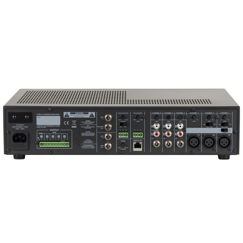 Встроенный селектор зон, коммутирующий высоковольтные выходы усилителя с пятью линиями громкоговорителей даёт возможность выбора, в какие зоны транслировать аудиосигнал. Помимо этого, усилитель оборудован 7-полосным графическим эквалайзером выходного аудиосигнала, позволяющего получать требуемую выразительность и громкость звучания транслируемой музыки и речи. Применение усилителя класса D и импульсный блок питания позволили добиться снижения веса усилителя и уменьшения потребляемой энергии без потери качества транслируемого звука.