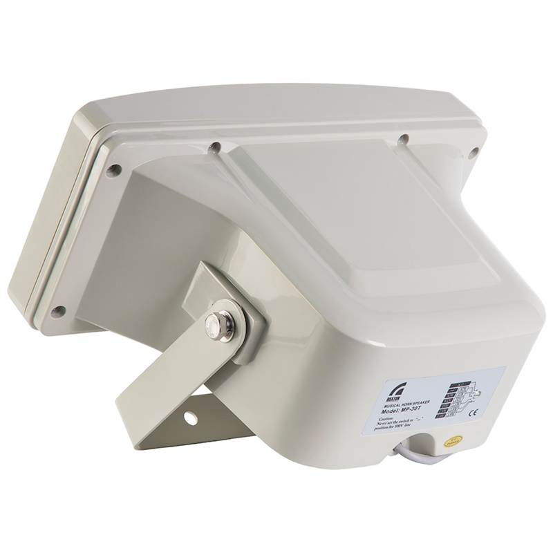 MP-30T – рупорный громкоговоритель мощностью 30Вт сочетает в себе хорошие акустические характеристики и удобство монтажа, что делает его незаменимым при построении систем речевого оповещения и музыкальной трансляции складов, вокзалов, парков и спортивных площадок.