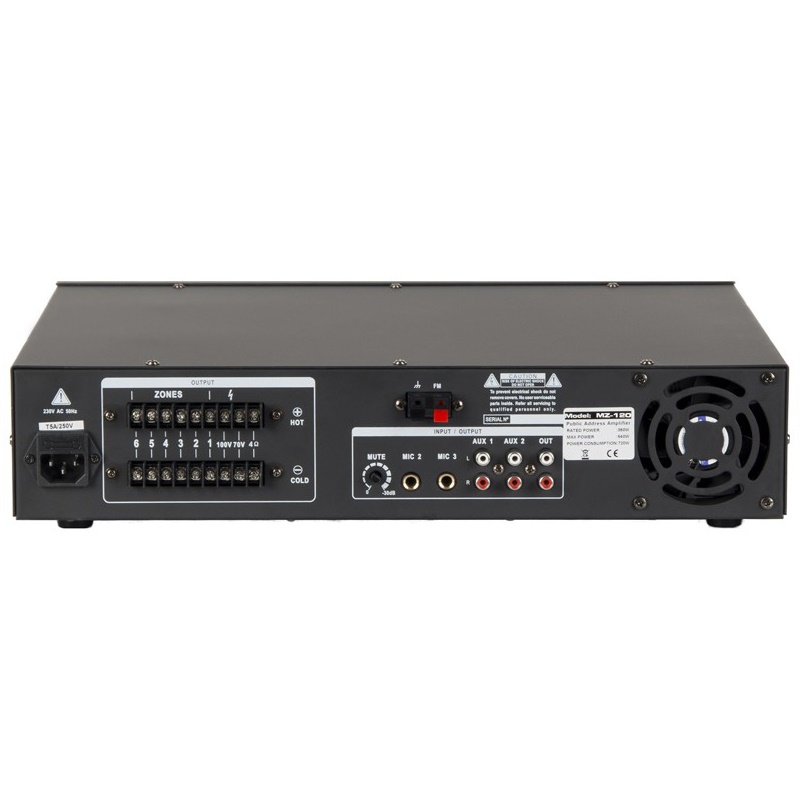 MZ-120 – комбинированный усилитель мощностью 120Вт позволяет строить многозонные системы речевого оповещения и музыкальной трансляции, не требуя при этом подключения дополнительных источников аудиосигнала. Два линейных и три микрофонных аудиовхода на задней панели дают широкий выбор источников аудиосигнала, а дополнительные низкоомные аудиовыходы позволяют подключать к усилителю акустические системы бытового и профессионального уровней.