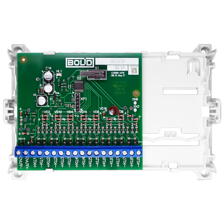 С2000-АР8 – адресный расширитель на 8 зон сигнализации. Работает с контроллером С2000-КДЛ. Селекция входного сигнала по длительности и фильтрации наводов 50Гц и 100Гц способствует повышенной помехоустойчивости. В устройство встроен датчик вскрытия корпуса. Адрес расширителя запоминается энергонезависимой памятью. Состояние зон и работоспособность отображается встроенной индикацией. К одному С2000-КДЛ можно подключить до 16 расширителей. Питание производится от линии связи.