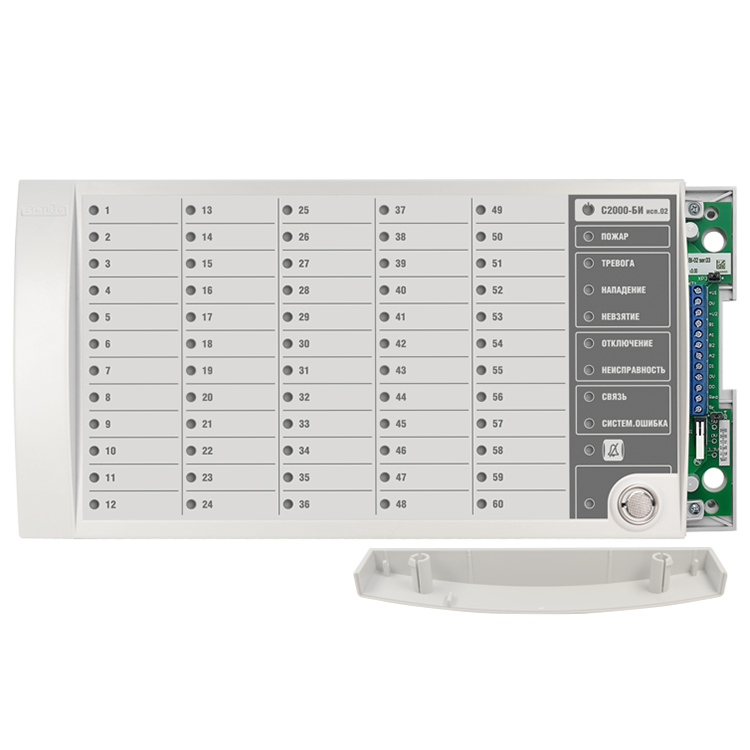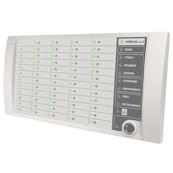 С2000-БИ исп.02 2RS485 – блок индикации, предназначен для работы в составе ИСО «Орион» совместно с сетевым контроллером (пультом контроля и управления охранно-пожарным С2000М или прибором приемно-контрольным и управления пожарным «Сириус», или их исполнениями). Применяется для обеспечения световой и звуковой индикации состояния разделов пожарной, охранной и технологической сигнализации, а также исполнительных устройств противопожарного оборудования, дистанционного взятия на охрану/снятия с охраны разделов охранной и пожарной сигнализации при помощи ключей Touch Memory.